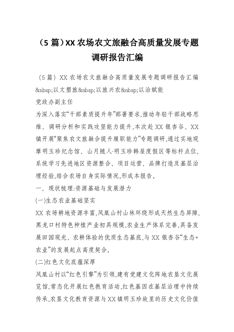 (5篇)XX农场农文旅融合高质量发展专题调研报告汇编
