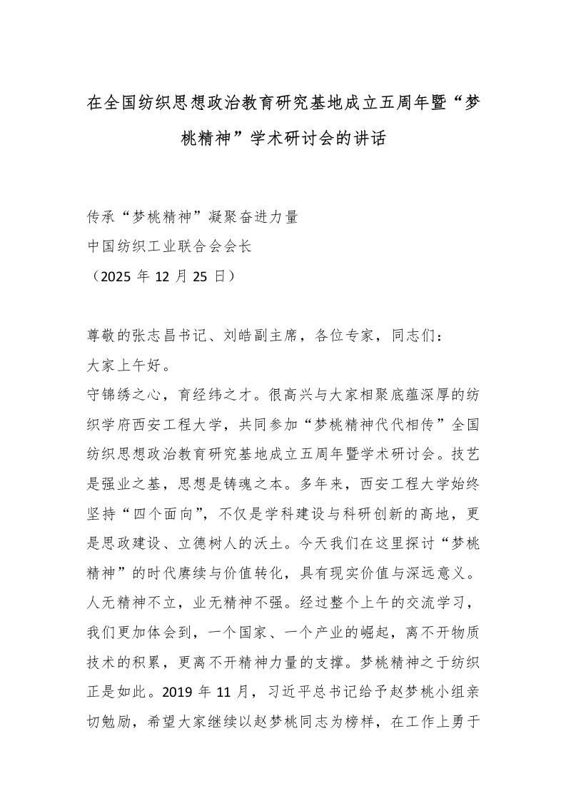 在全国纺织思想政治教育研究基地成立五周年暨“梦桃精神”学术研讨会的讲话_副本