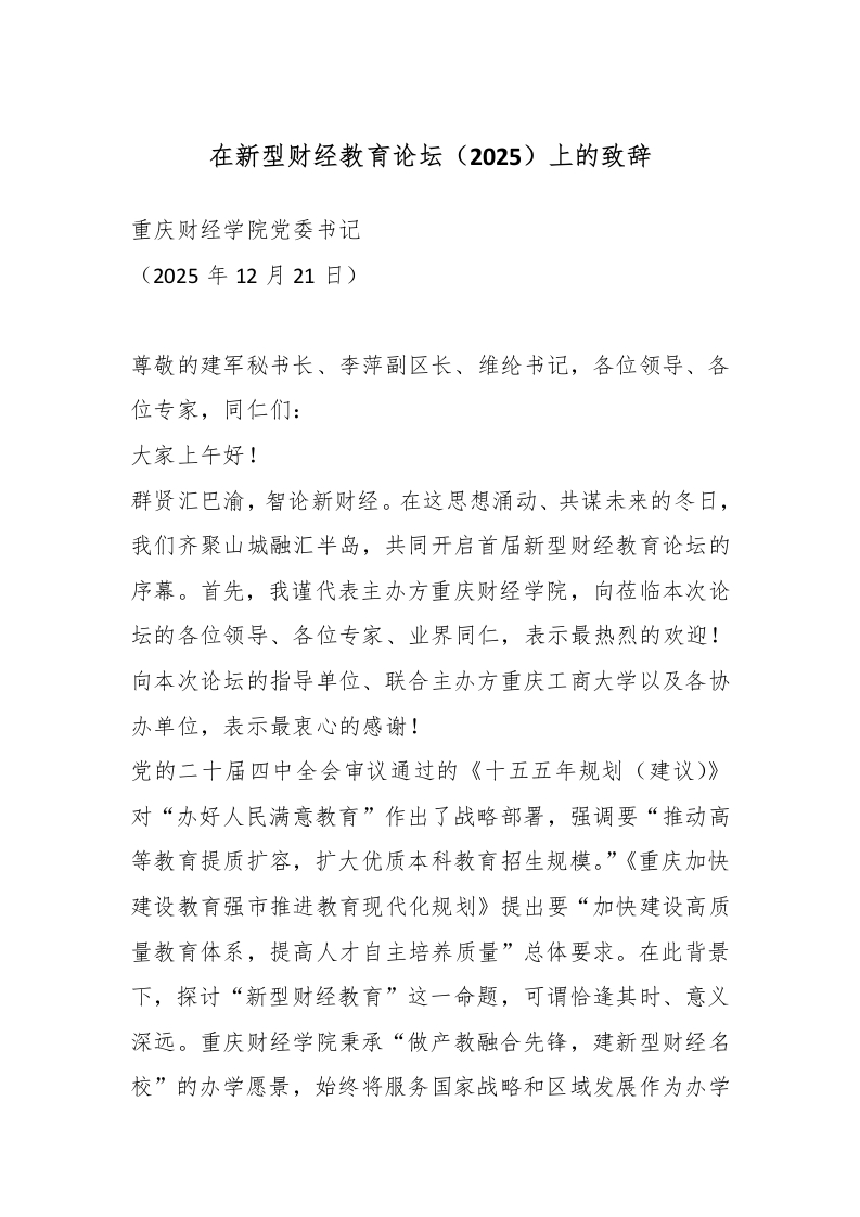 首页精选范文在新型财经教育论坛(2025)上的致辞_副本