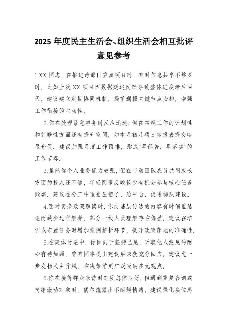 2025年度民主生活会、组织生活会相互批评意见参考