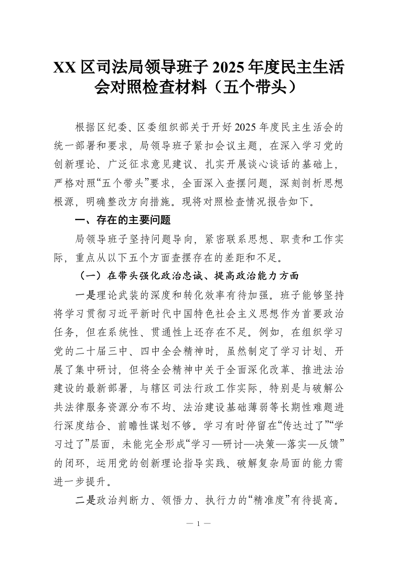 XX区司法局领导班子2025年度民主生活会对照检查材料(五个带头)_副本