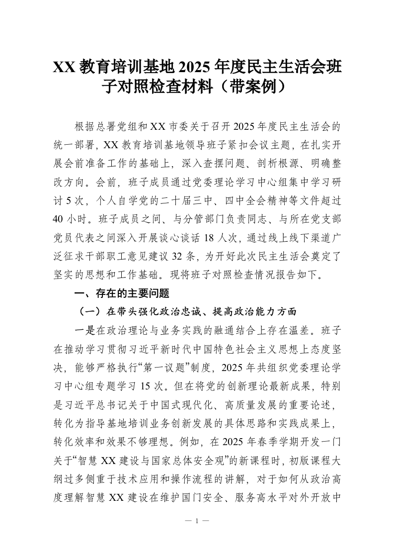 XX教育培训基地2025年度民主生活会班子对照检查材料(带案例)