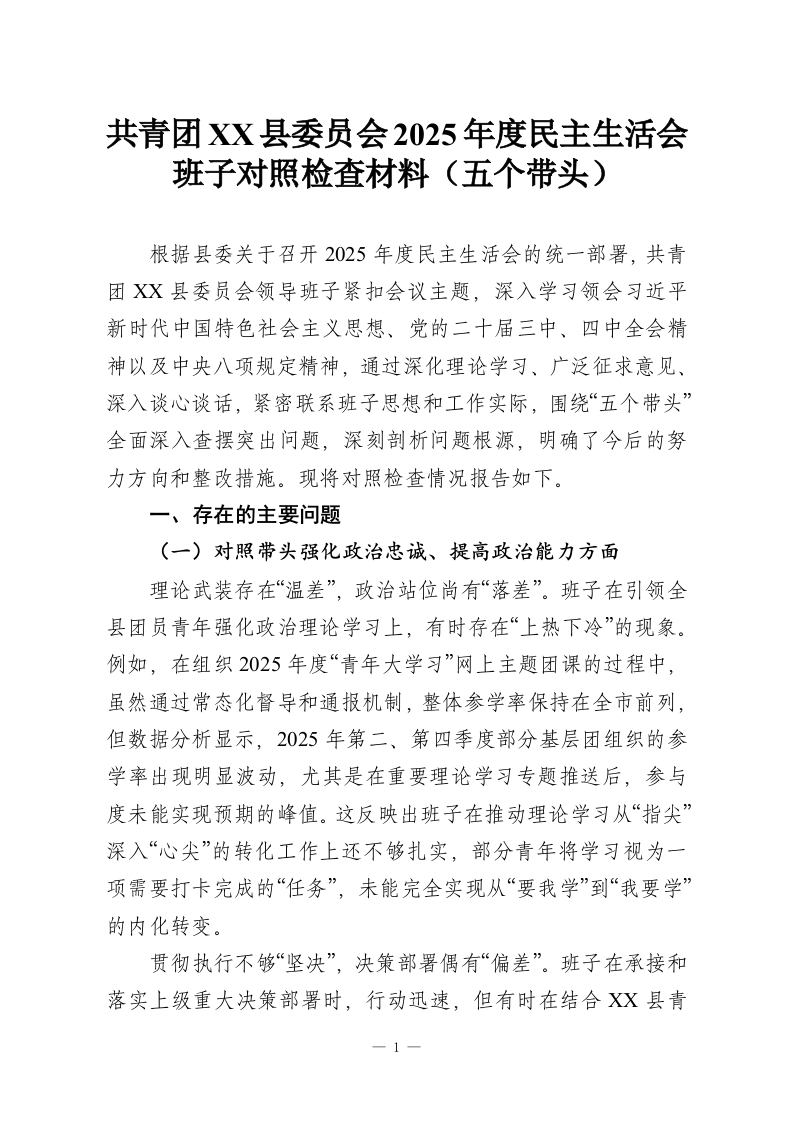 共青团XX县委员会2025年度民主生活会班子对照检查材料(五个带头)