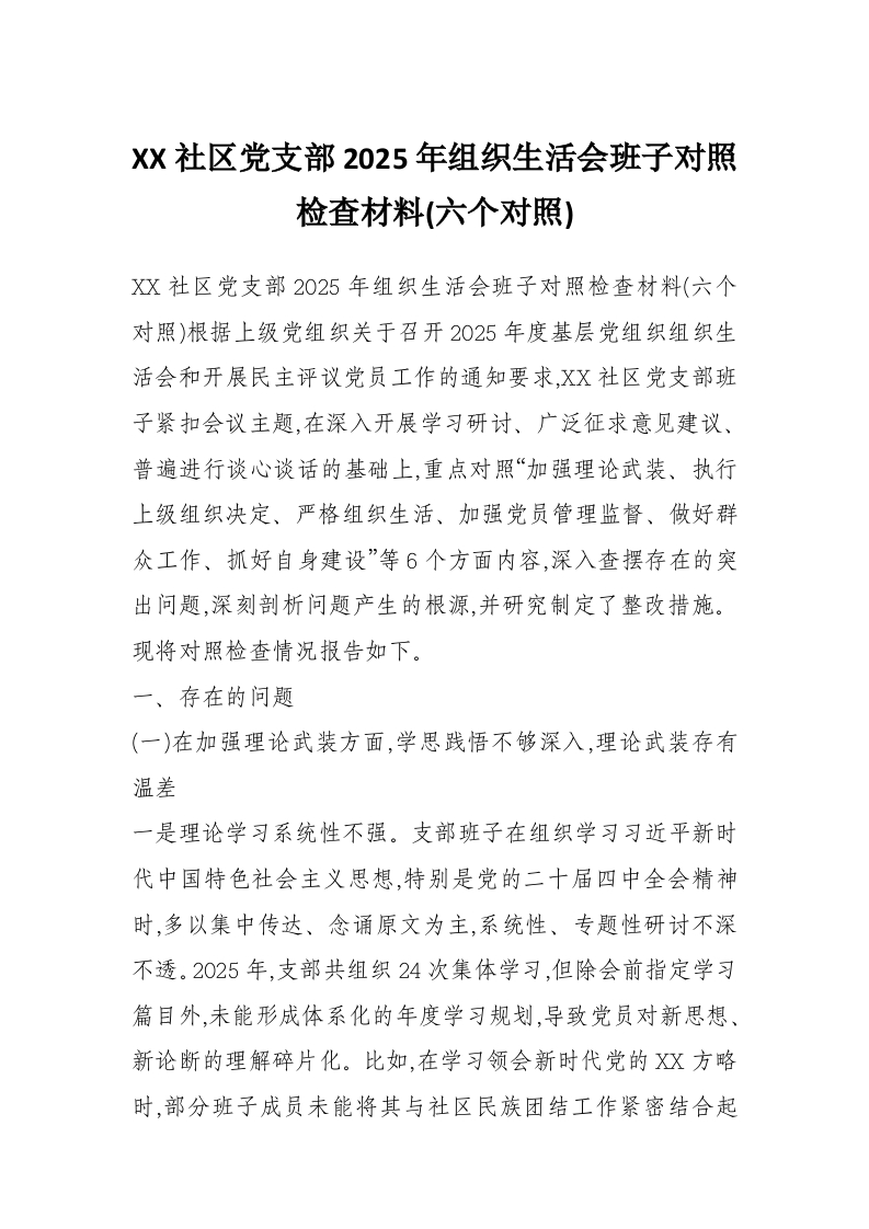 XX社区党支部2025年组织生活会班子对照检查材料(六个对照)