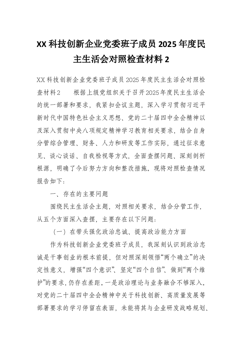 首页材料汇编XX科技创新企业党委班子成员2025年度民主生活会对照检查材料2