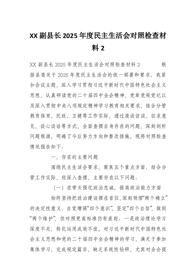 首页材料汇编XX副县长2025年度民主生活会对照检查材料2