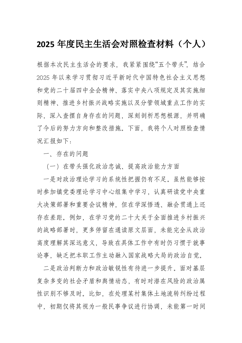 首页学习提升2025年度民主生活会对照检查材料(个人)