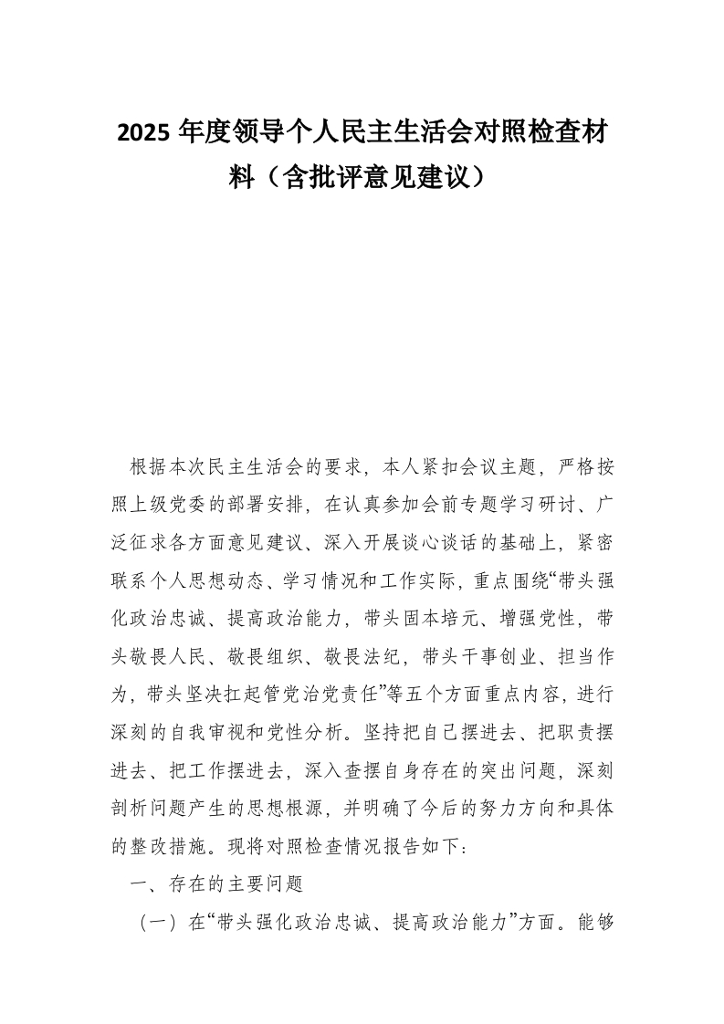 2025年度领导个人民主生活会对照检查材料(含批评意见建议)