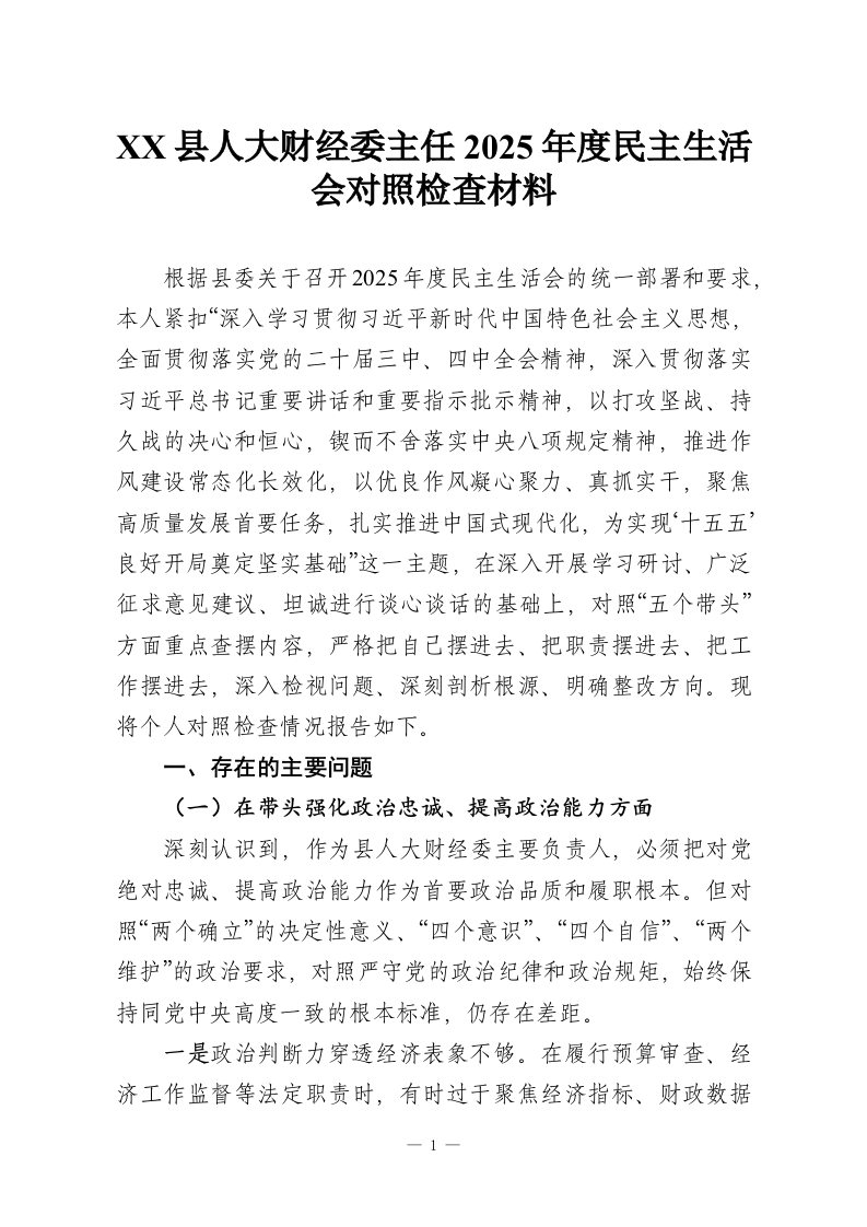 XX县人大财经委主任2025年度民主生活会对照检查材料