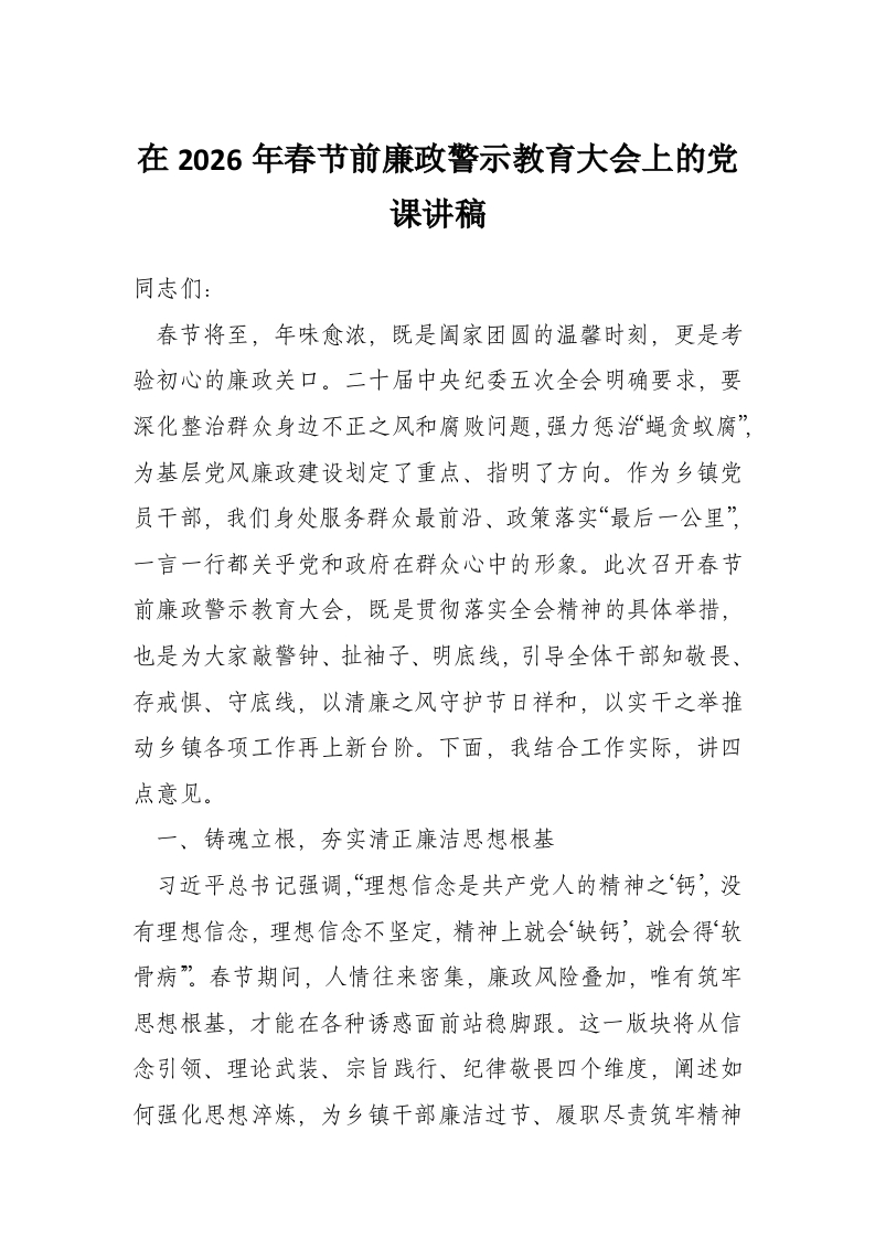 首页讲课讲稿在2026年春节前廉政警示教育大会上的党课讲稿