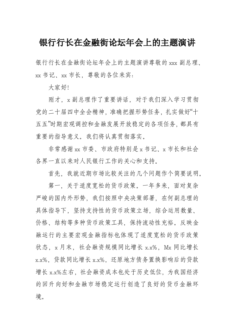 银行行长在金融街论坛年会上的主题演讲