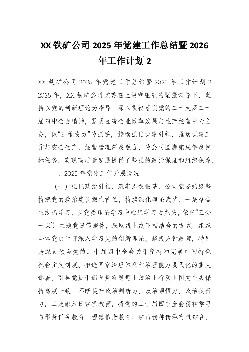 首页材料汇编XX铁矿公司2025年党建工作总结暨2026年工作计划2