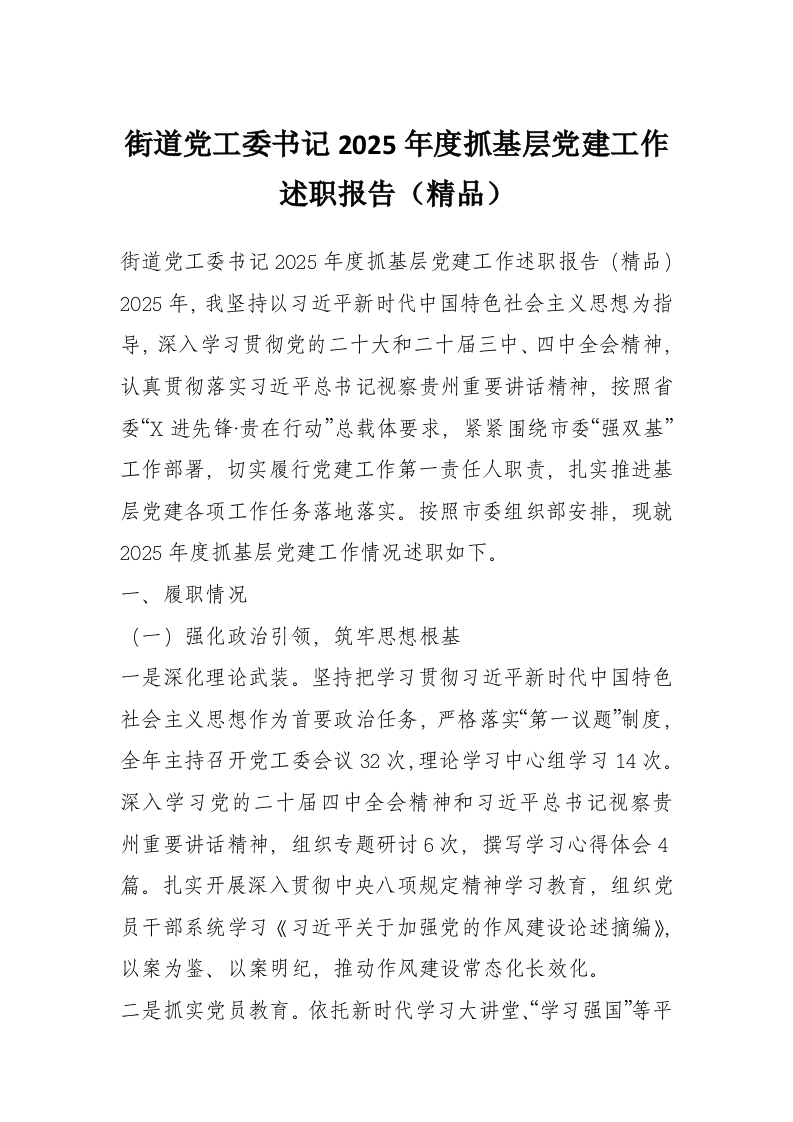 街道党工委书记2025年度抓基层党建工作述职报告(精品)