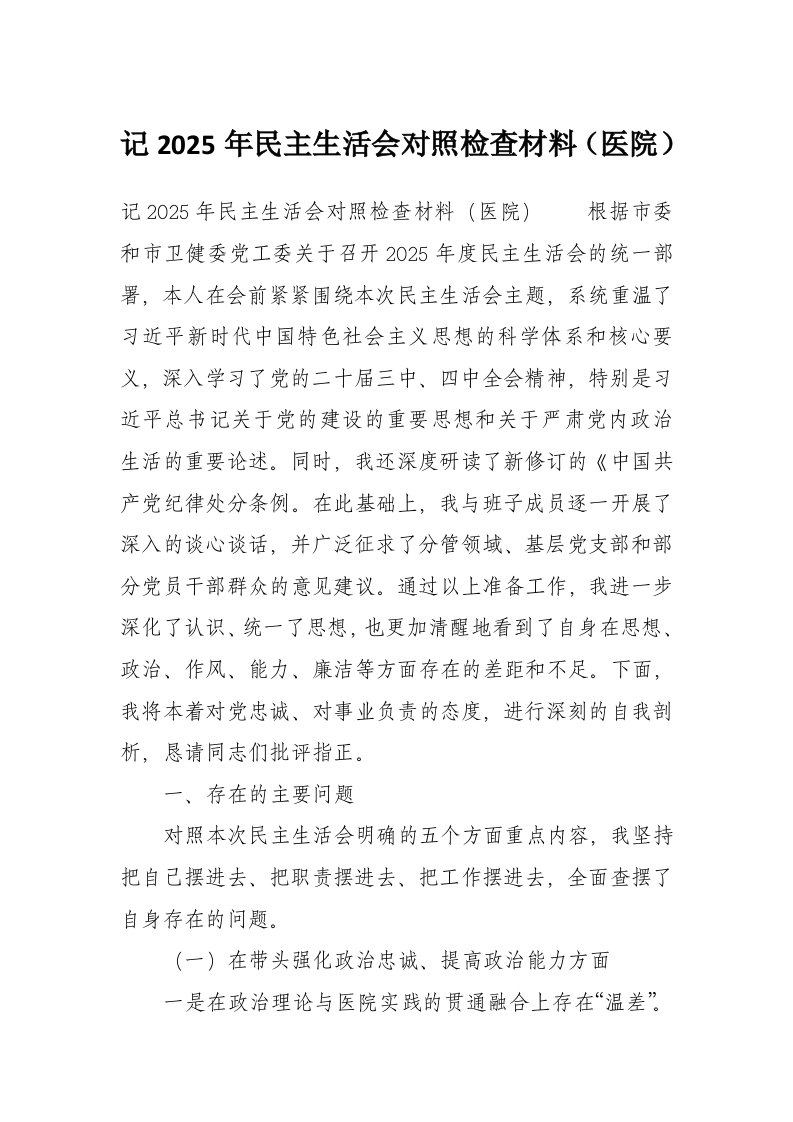 记2025年民主生活会对照检查材料(医院)