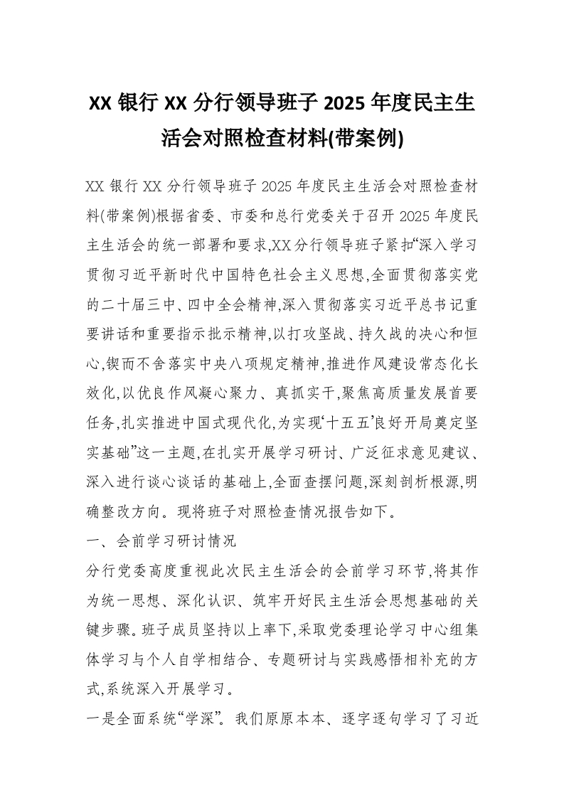 XX银行XX分行领导班子2025年度民主生活会对照检查材料(带案例)