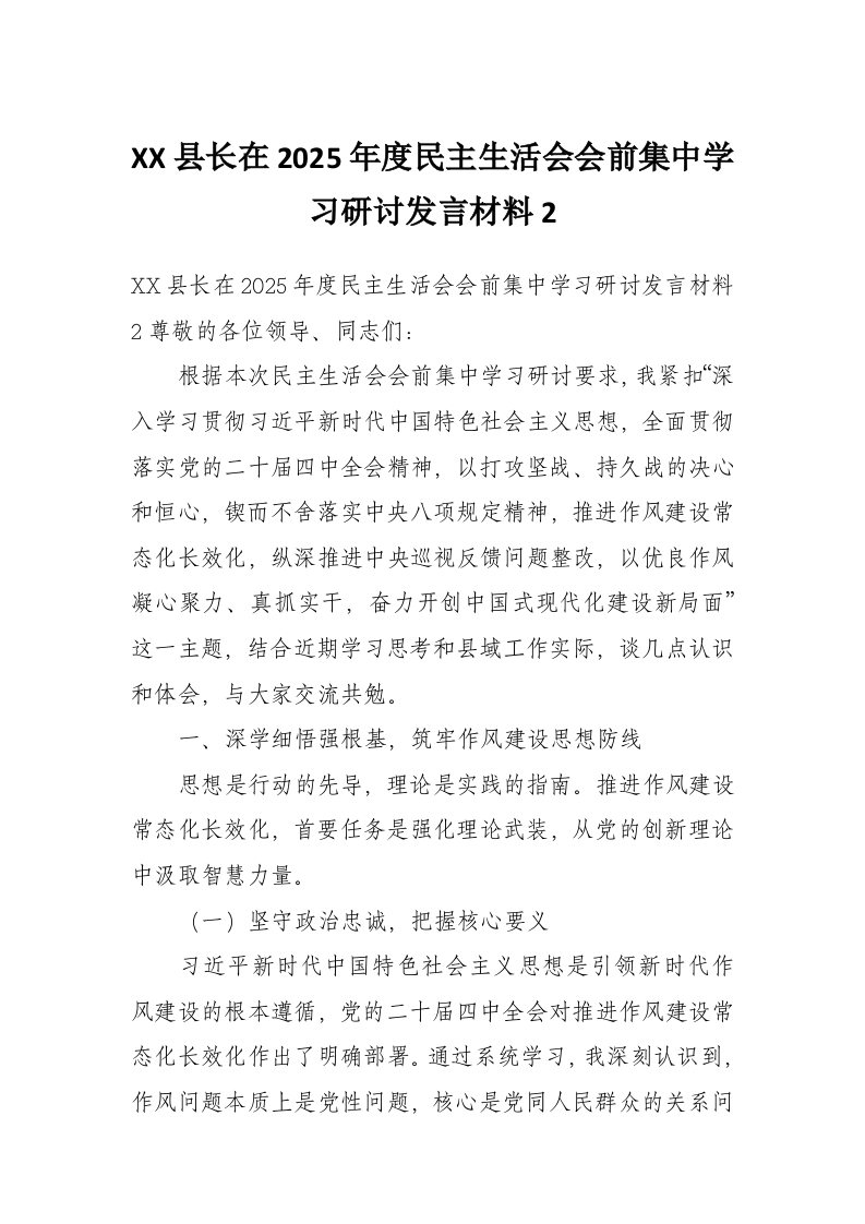 XX县长在2025年度民主生活会会前集中学习研讨发言材料2