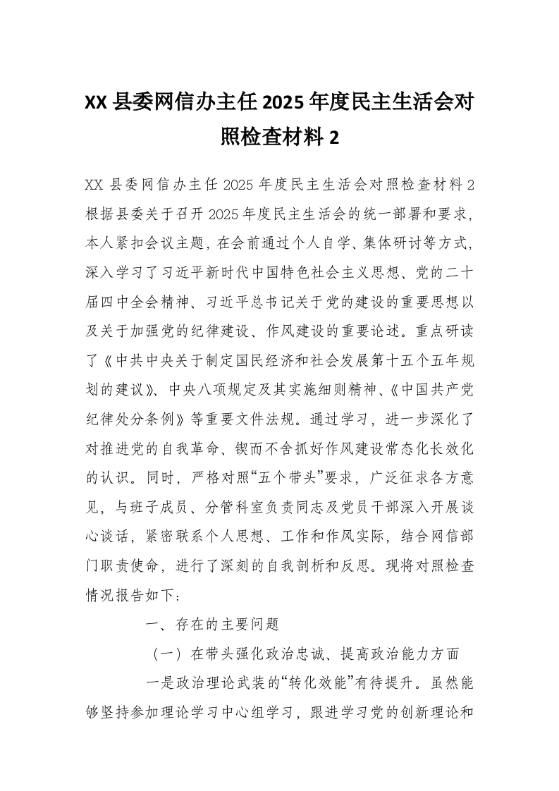 首页学习提升XX县委网信办主任2025年度民主生活会对照检查材料2