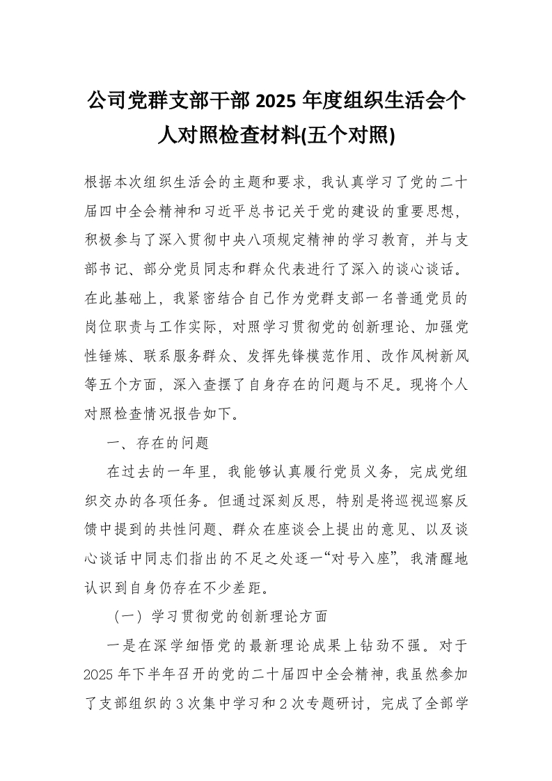 公司党群支部干部2025年度组织生活会个人对照检查材料(五个对照)