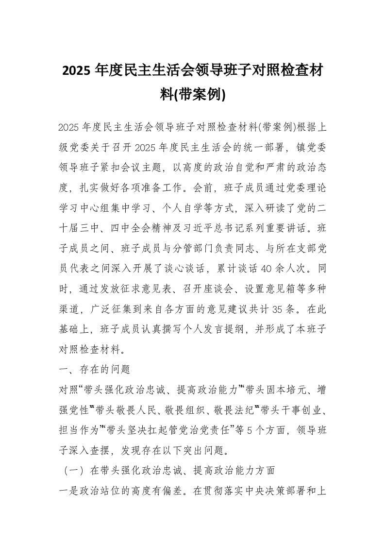 2025年度民主生活会领导班子对照检查材料(带案例)