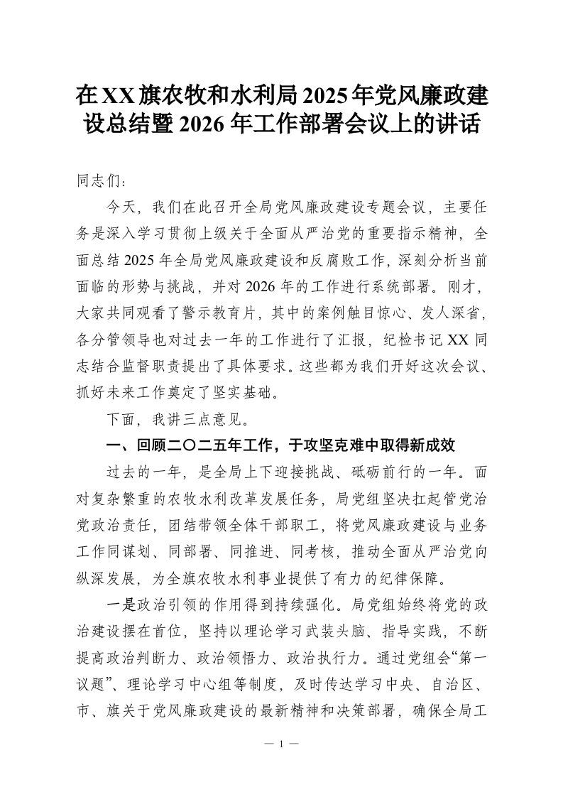 在XX旗农牧和水利局2025年党风廉政建设总结暨2026年工作部署会议上的讲话