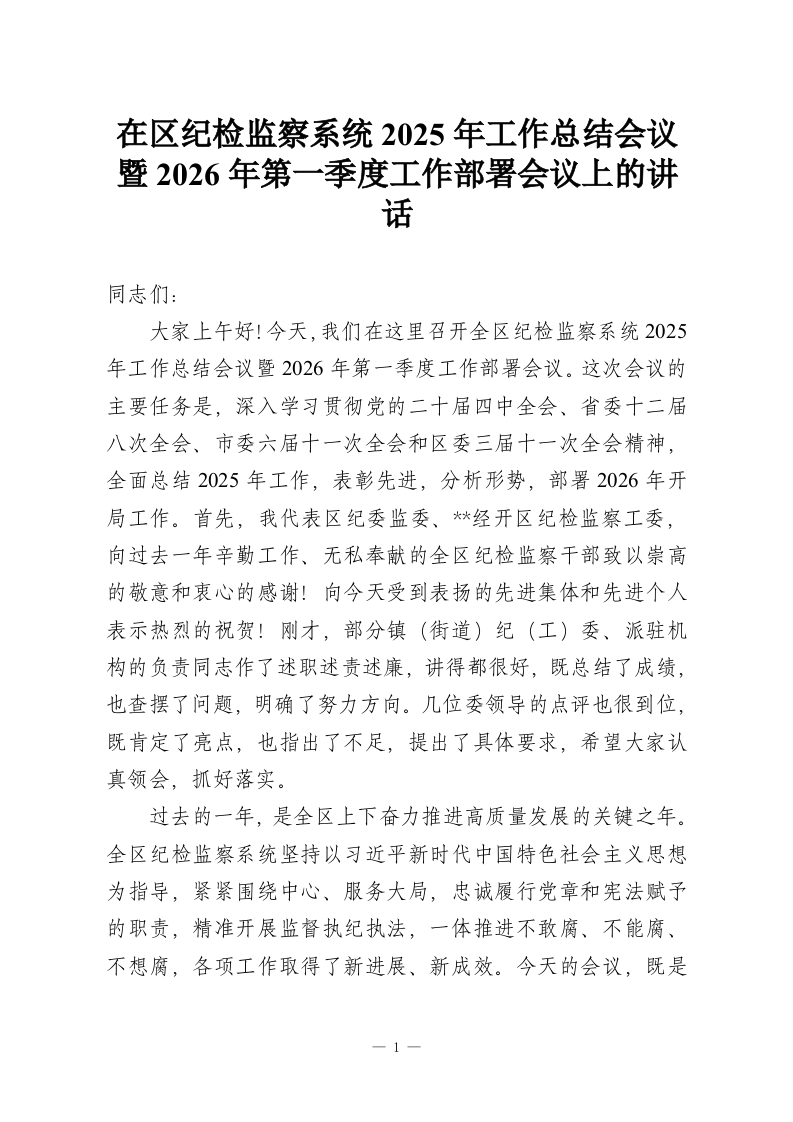 在区纪检监察系统2025年工作总结会议暨2026年第一季度工作部署会议上的讲话