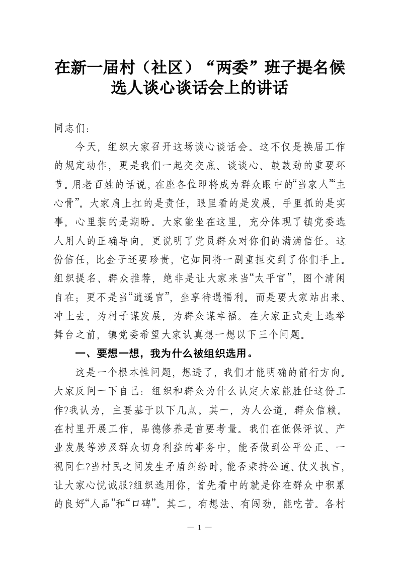 在新一届村(社区)“两委”班子提名候选人谈心谈话会上的讲话