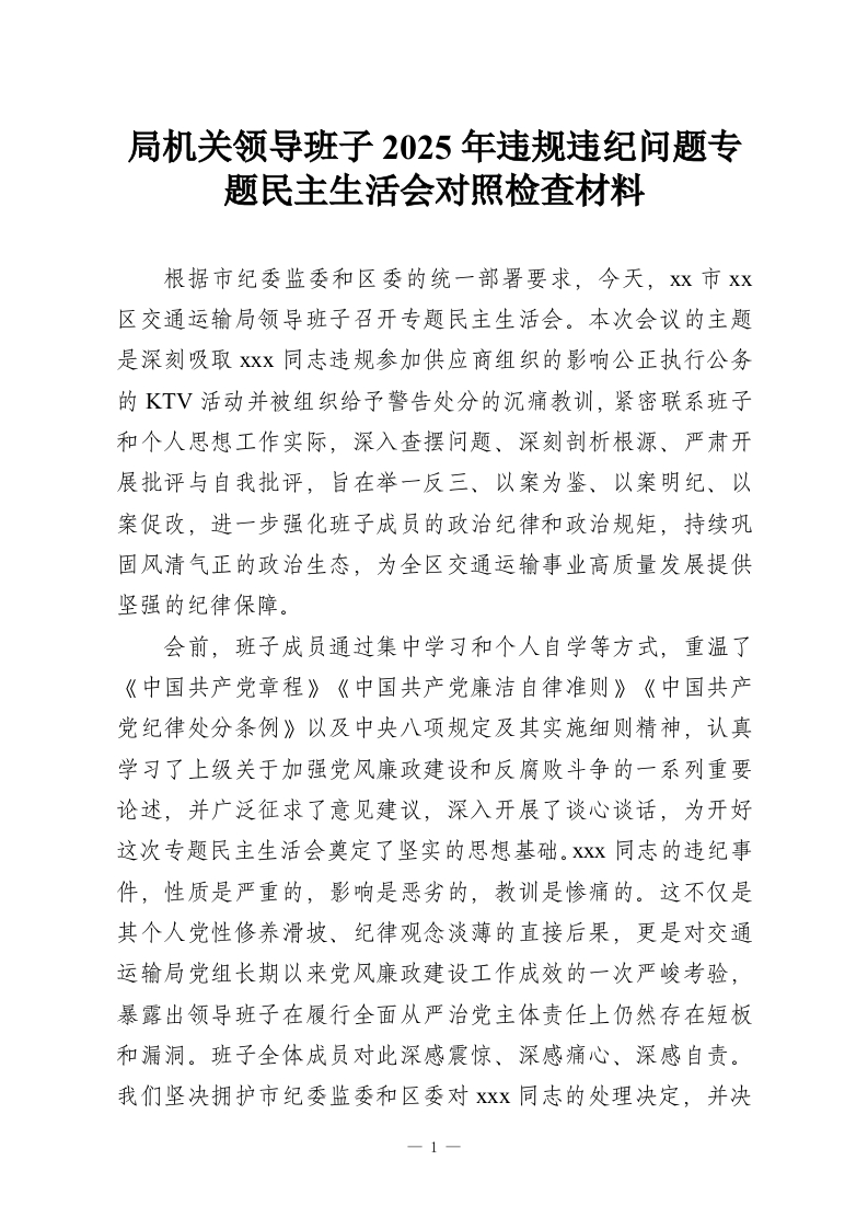 首页写作素材局机关领导班子2025年违规违纪问题专题民主生活会对照检查材料