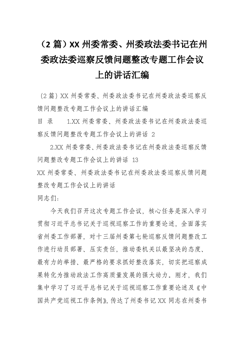 (2篇)XX州委常委、州委政法委书记在州委政法委巡察反馈问题整改专题工作会议上的讲话汇编