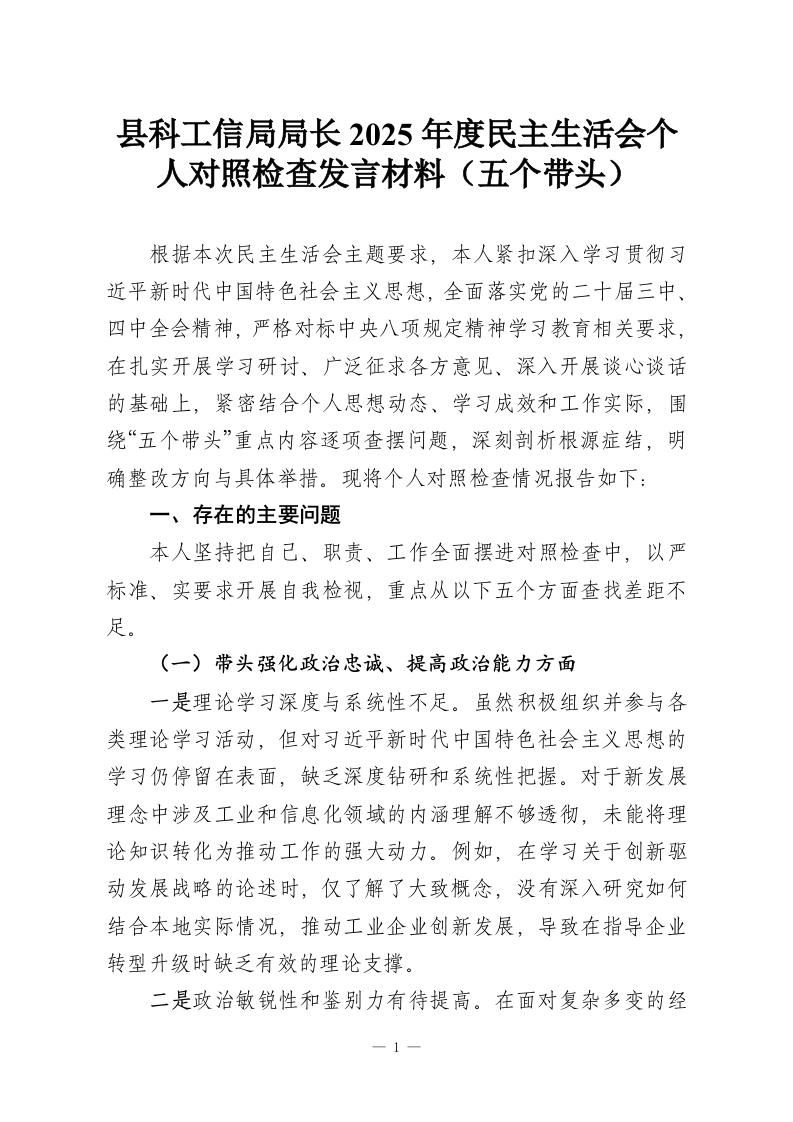 县科工信局局长2025年度民主生活会个人对照检查发言材料(五个带头)