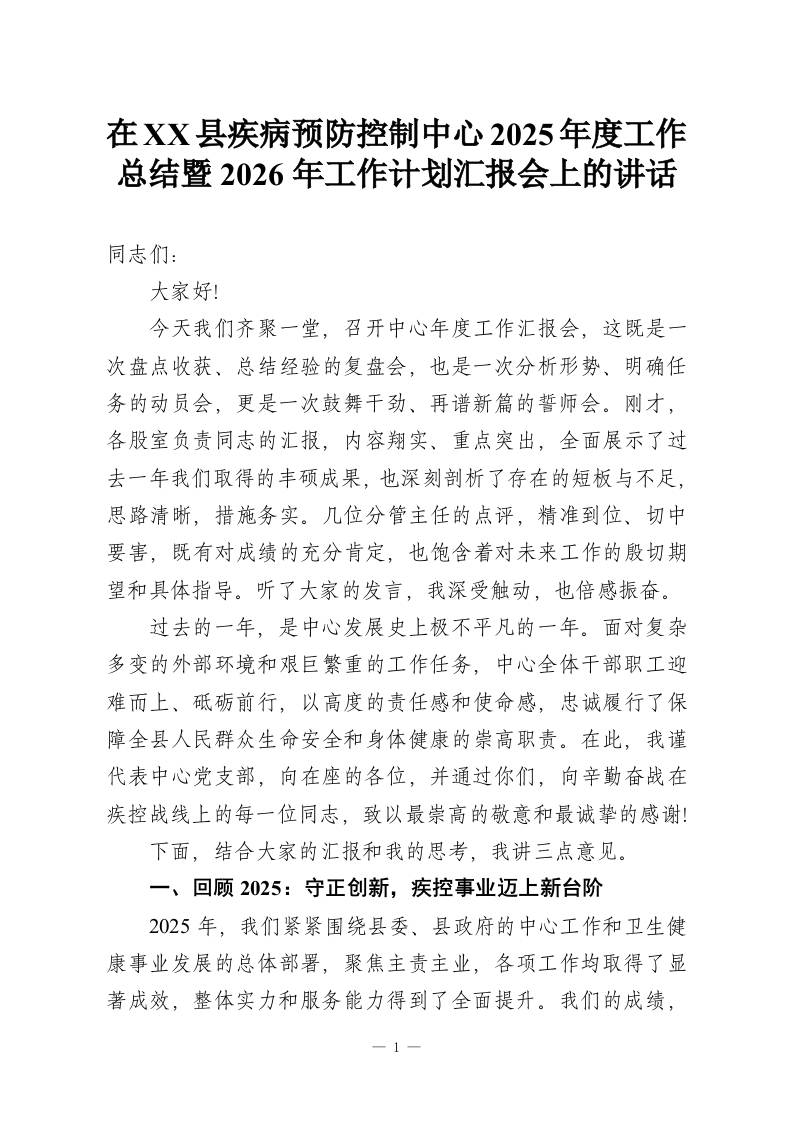 首页讲课讲稿在XX县疾病预防控制中心2025年度工作总结暨2026年工作计划汇报会上的讲话