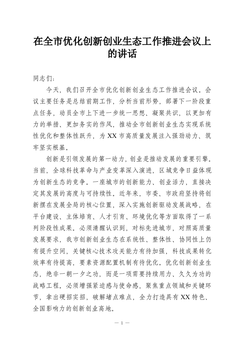 首页讲课讲稿在全市优化创新创业生态工作推进会议上的讲话