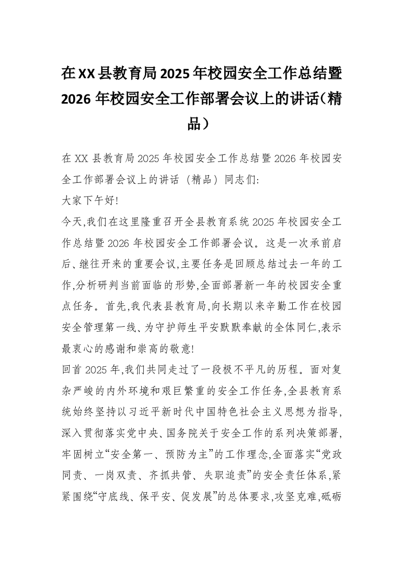 首页工作文档在XX县教育局2025年校园安全工作总结暨2026年校园安全工作部署会议上的讲话(精品)