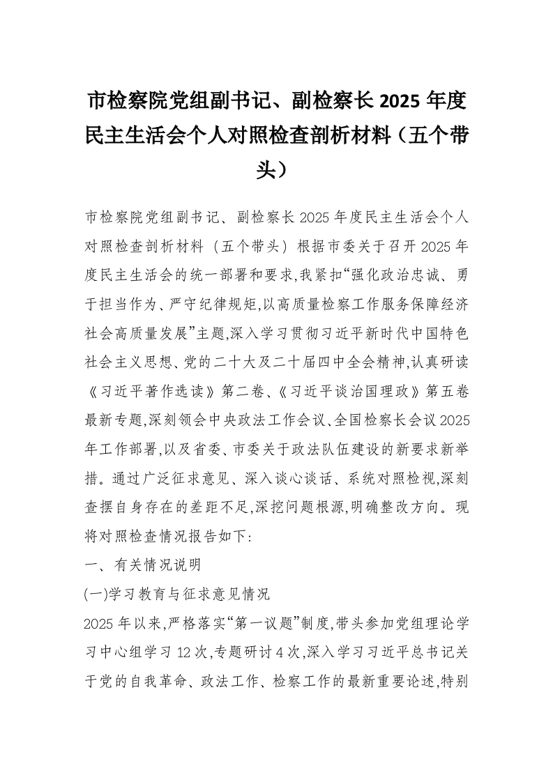 首页工作文档市检察院党组副书记、副检察长2025年度民主生活会个人对照检查剖析材料(五个带头)