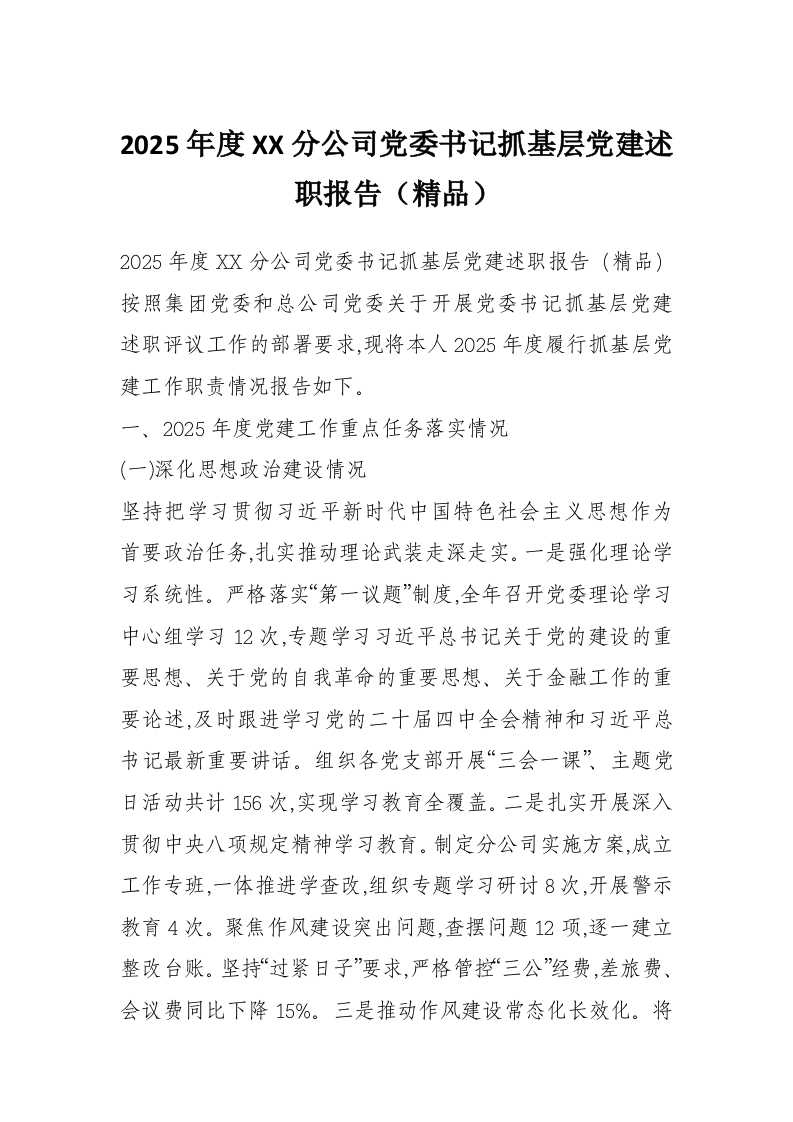 2025年度XX分公司党委书记抓基层党建述职报告(精品)