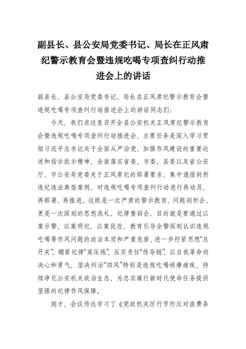 副县长、县公安局党委书记、局长在正风肃纪警示教育会暨违规吃喝专项查纠行动推进会上的讲话