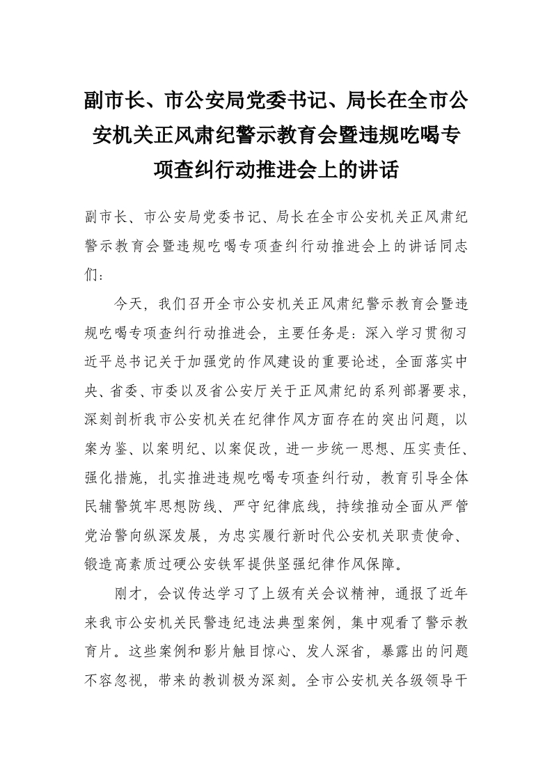 副市长、市公安局党委书记、局长在全市公安机关正风肃纪警示教育会暨违规吃喝专项查纠行动推进会上的讲话