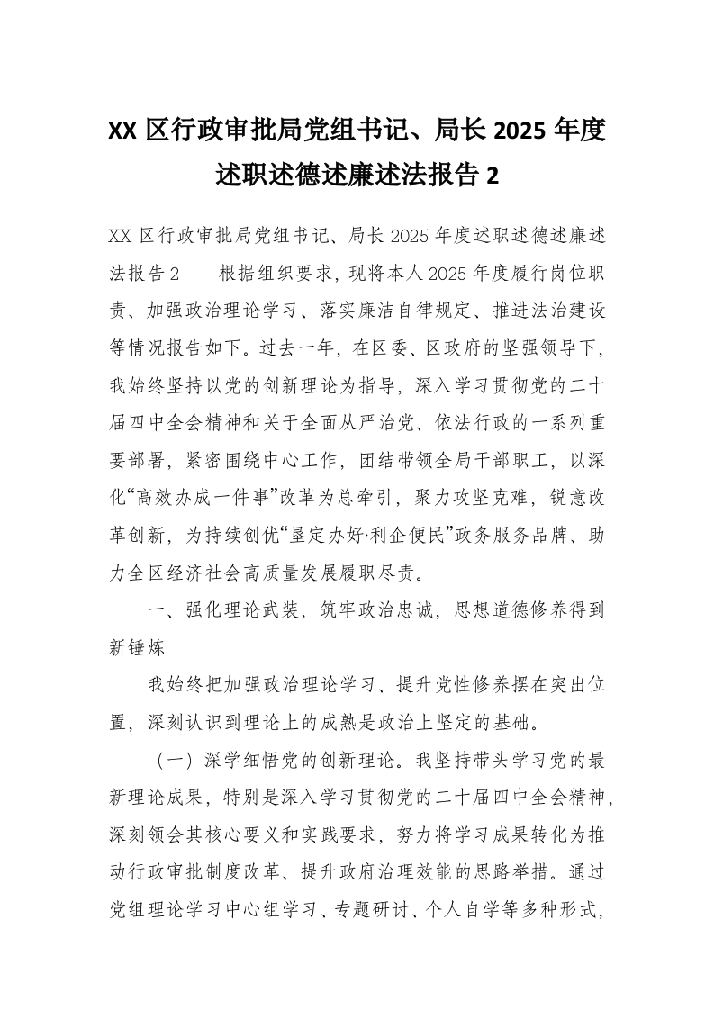 XX区行政审批局党组书记、局长2025年度述职述德述廉述法报告2