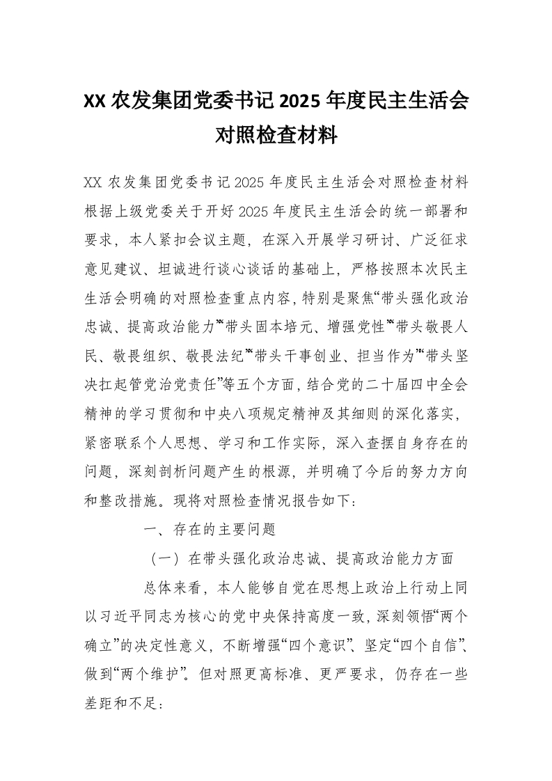首页写作素材XX农发集团党委书记2025年度民主生活会对照检查材料