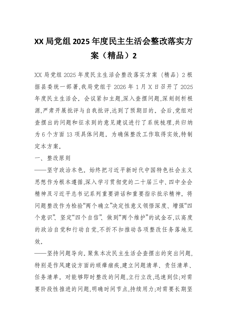 XX局党组2025年度民主生活会整改落实方案(精品)2