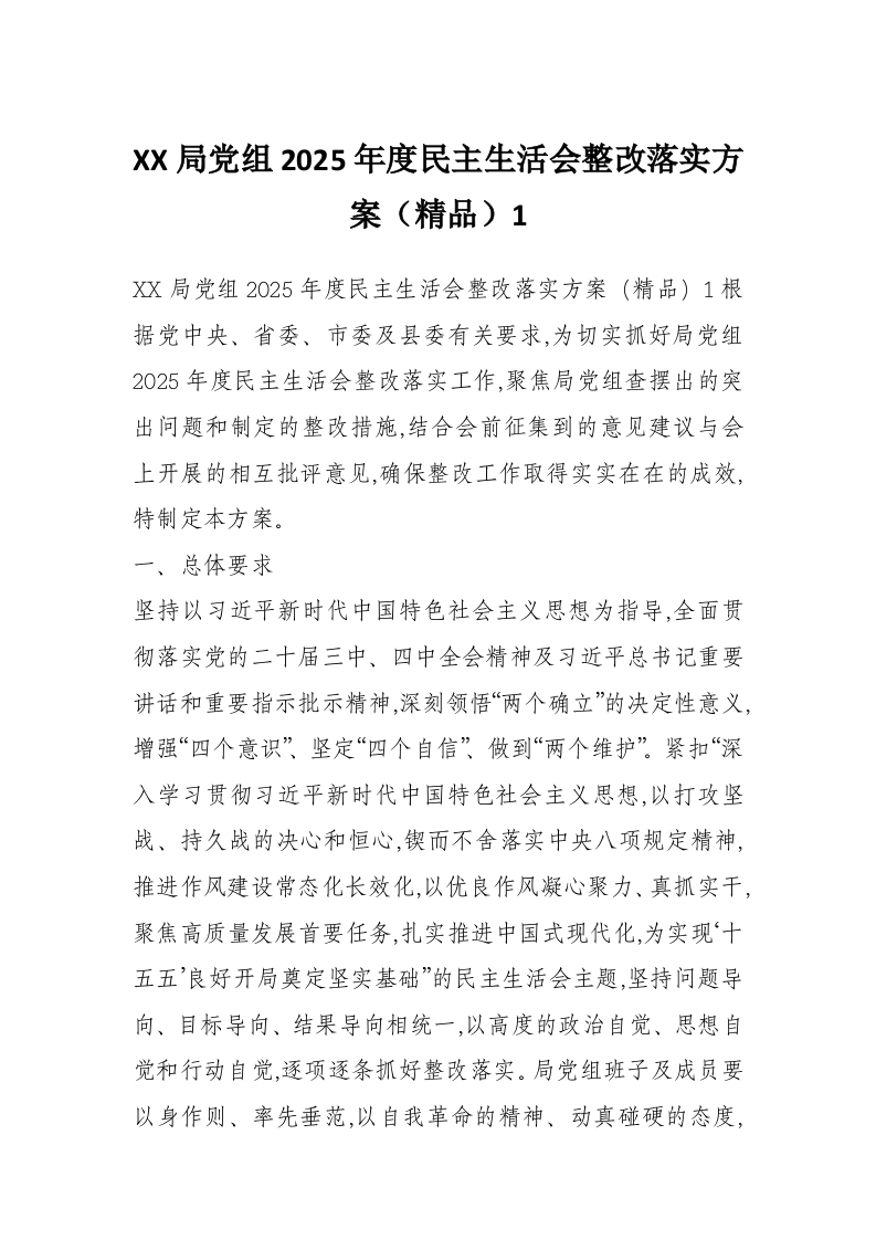 XX局党组2025年度民主生活会整改落实方案(精品)1