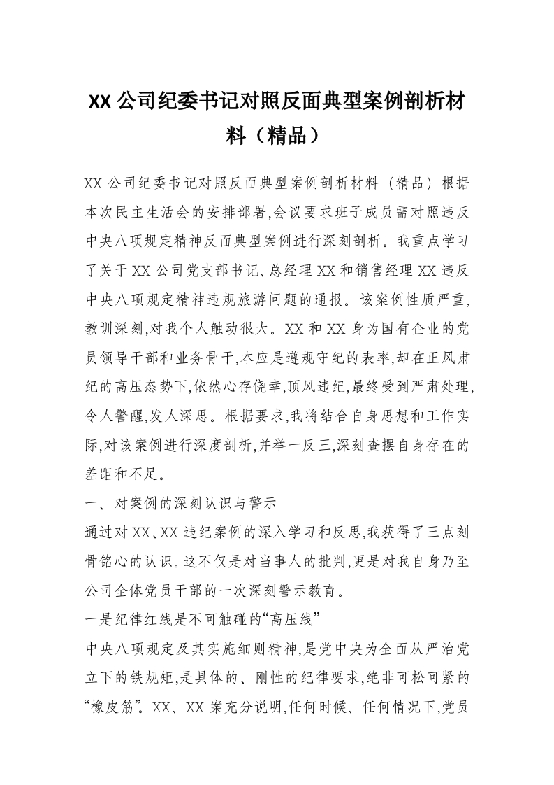 XX公司纪委书记对照反面典型案例剖析材料(精品)