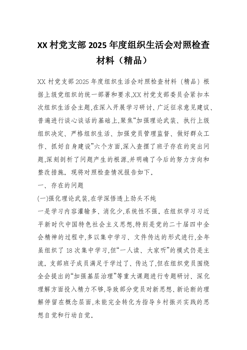 XX村党支部2025年度组织生活会对照检查材料(精品)