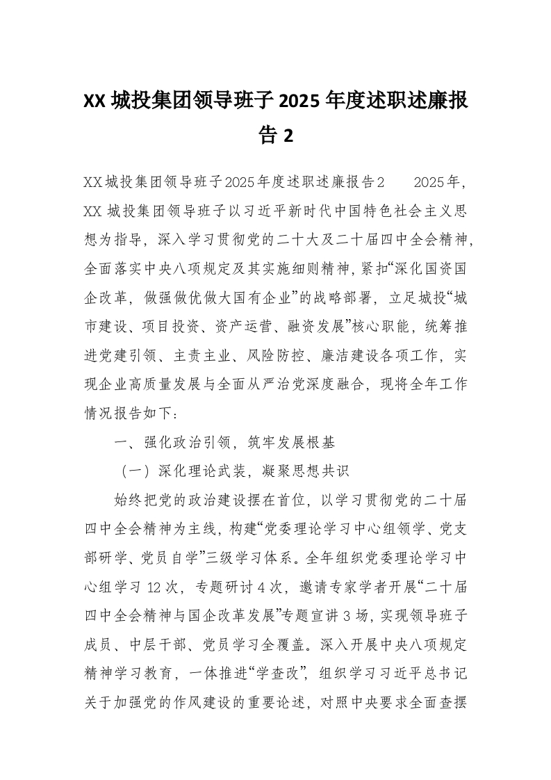 XX城投集团领导班子2025年度述职述廉报告2