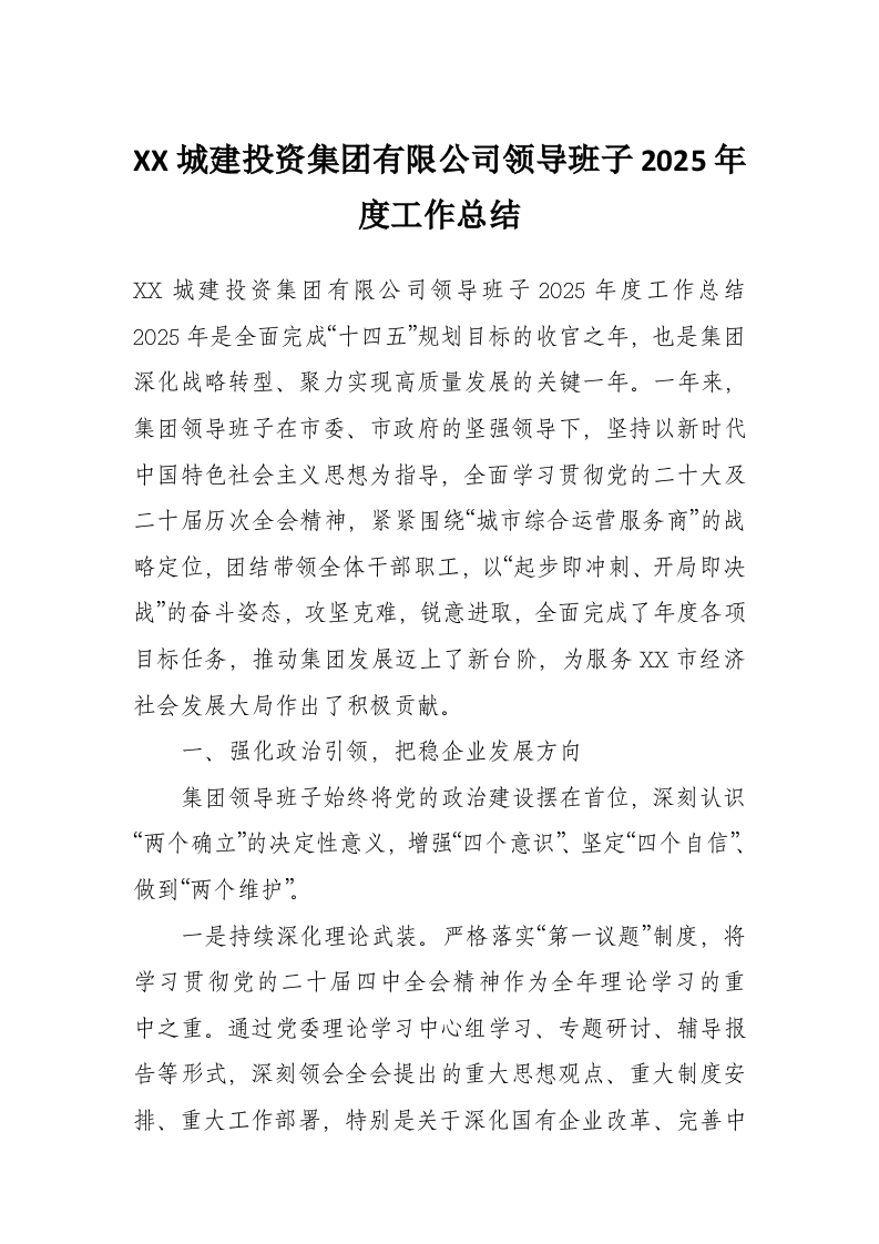 XX城建投资集团有限公司领导班子2025年度工作总结