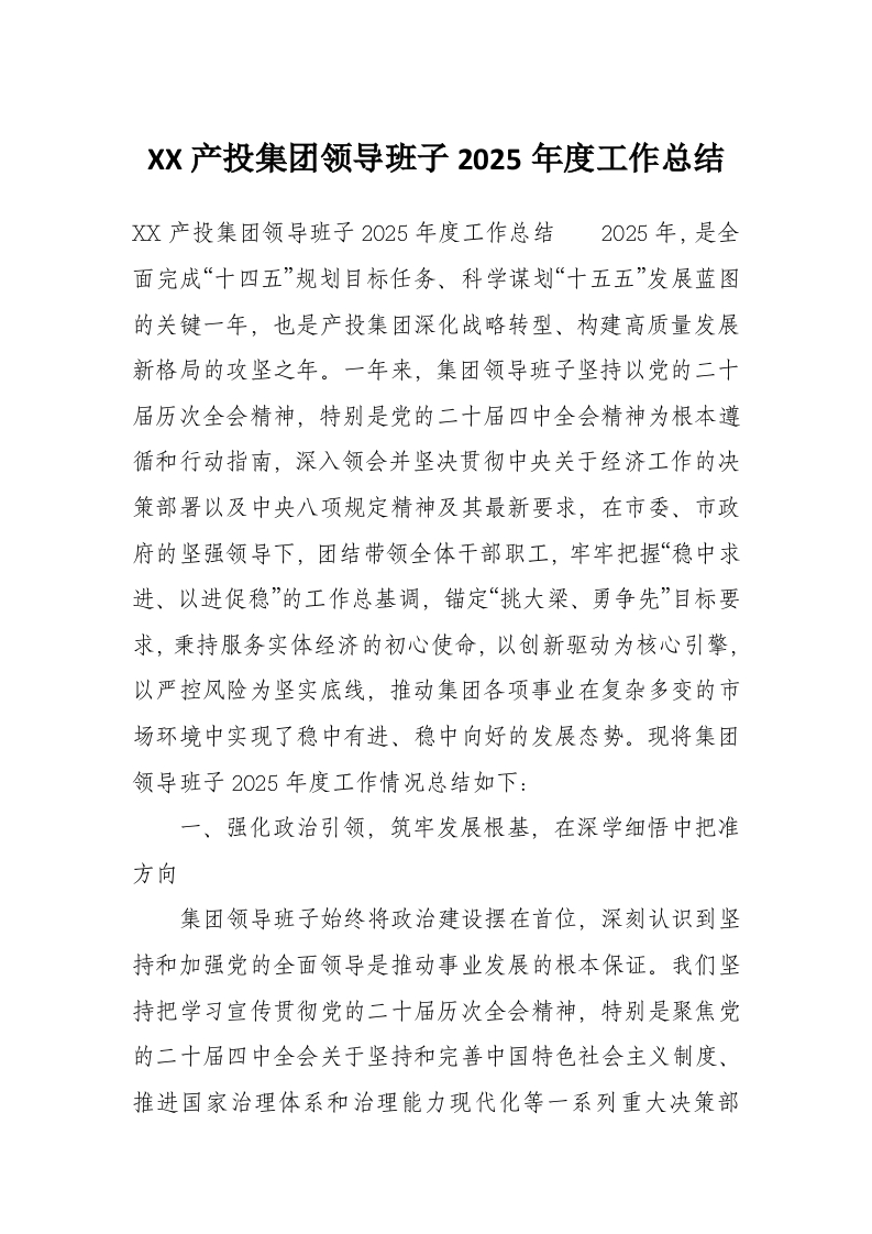 XX产投集团领导班子2025年度工作总结