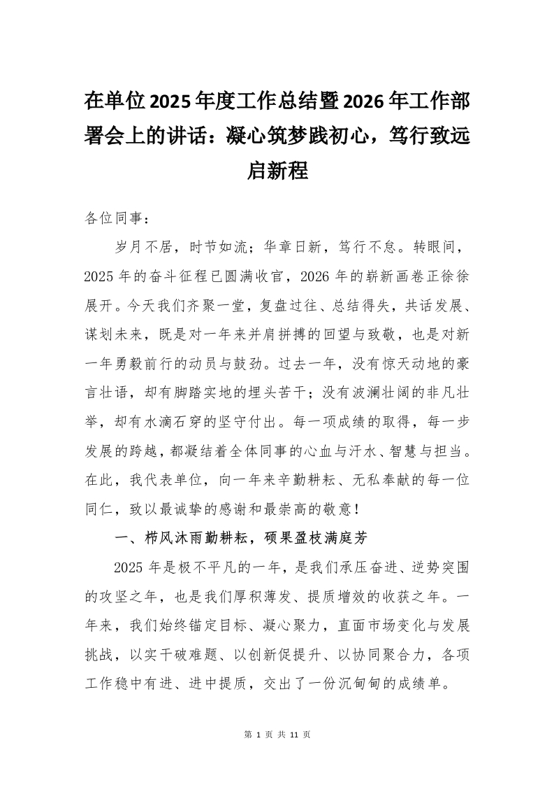 在单位2025年度工作总结暨2026年工作部署会上的讲话:凝心筑梦践初心,笃行致远启新程