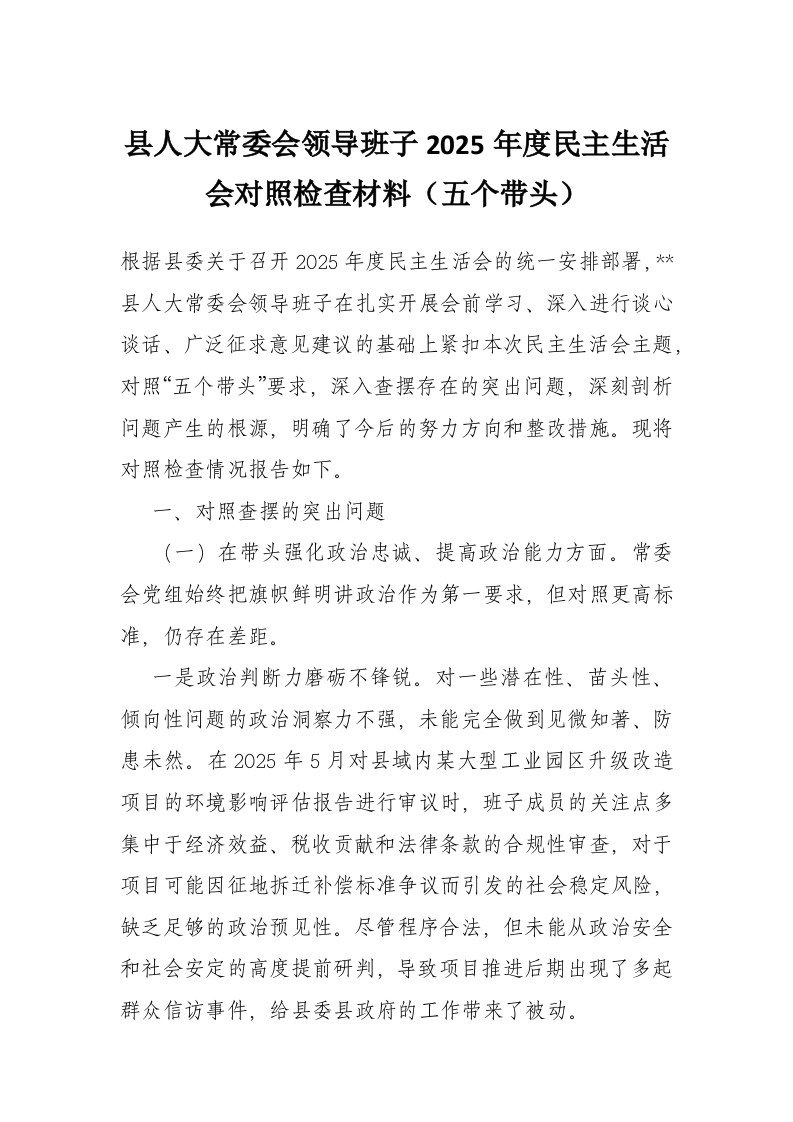 首页工作文档县人大常委会领导班子2025年度民主生活会对照检查材料(五个带头)