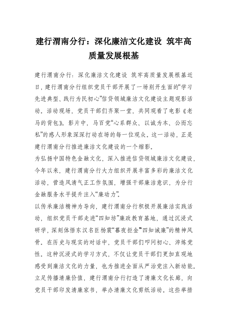 建行渭南分行:深化廉洁文化建设 筑牢高质量发展根基