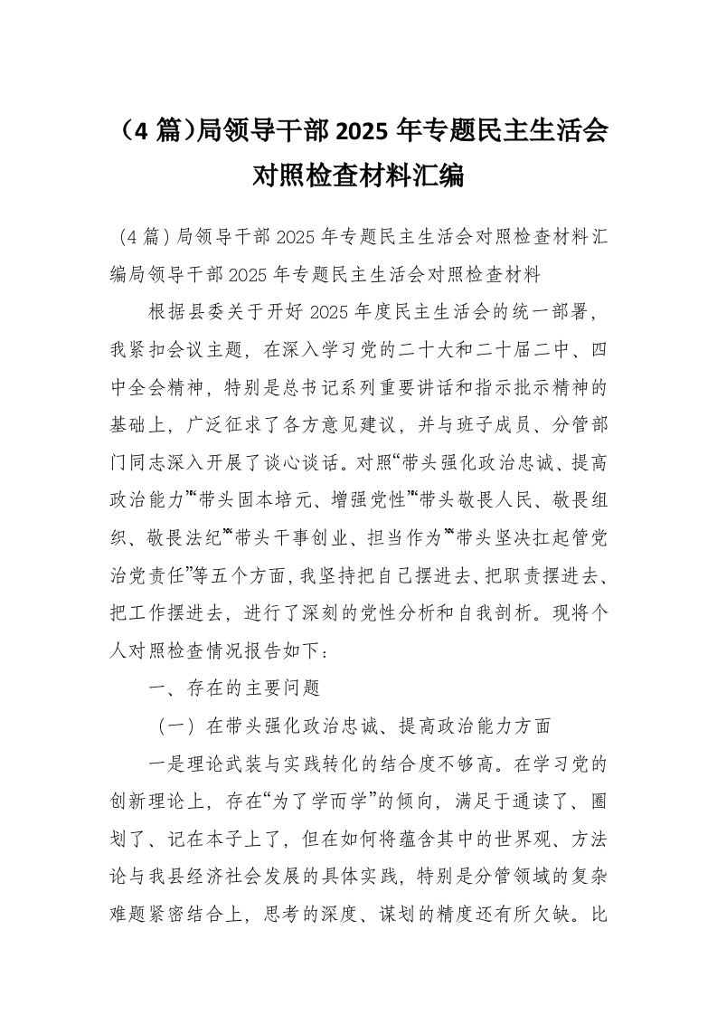(4篇)局领导干部2025年专题民主生活会对照检查材料汇编