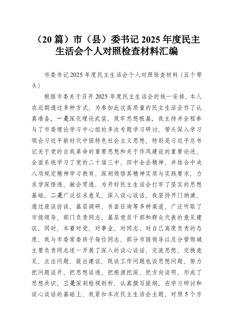 (20篇)市(县)委书记2025年度民主生活会个人对照检查材料汇编